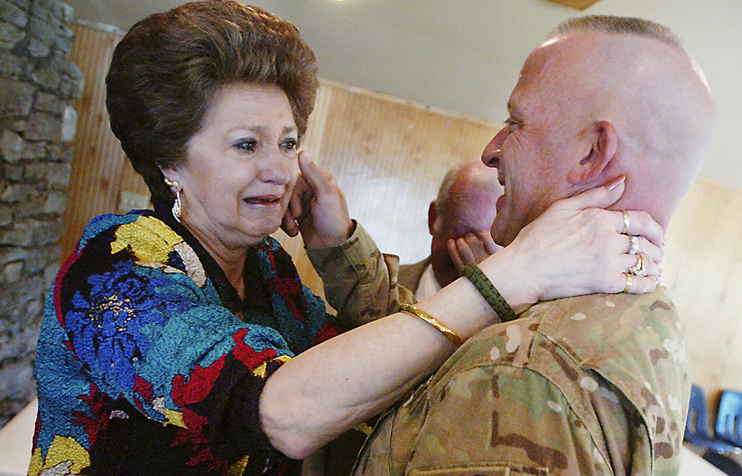 Platoon Sgt. John Black with the KY National Guard ADT IV group wipes a tear away from his mother Louise Black’s face after surprising her and his father Jack Black with his homecoming during their 50th wedding anniversary celebration at the Frankfort Plant Board clubhouse in Frankfort, Ky.