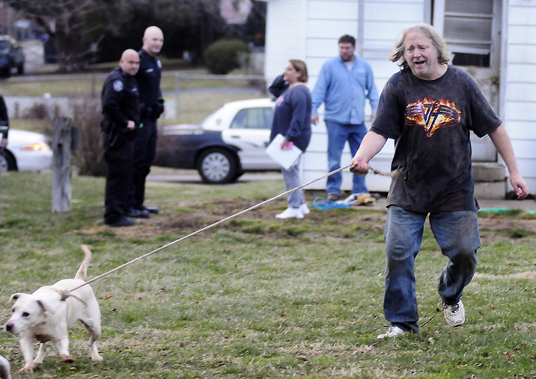 John Tabor leads one of his 17 dogs through the backyard of his house at 131 Willis Ave. in Frankfort, Ky. Tabor surrendered 17 dogs and seven cats to the city.