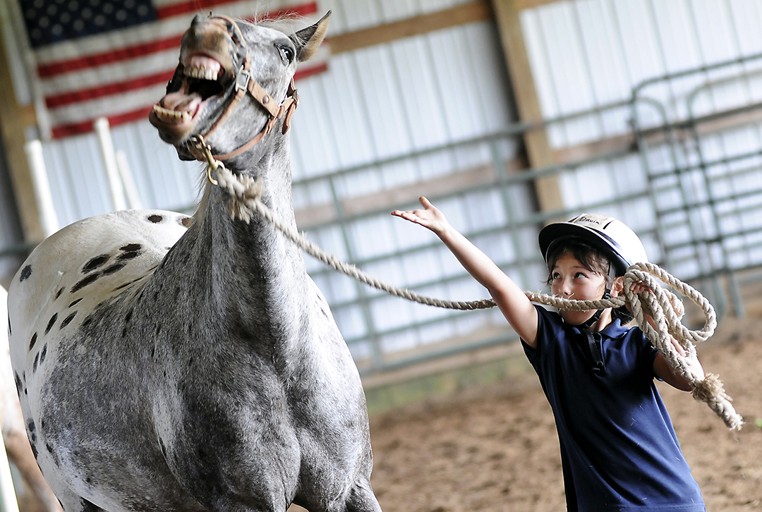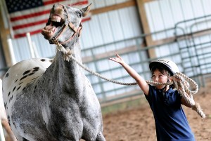 Davia Geders, 8, losses grip of the rope as the horse she is leading lifts it’s head and yawns during Horse Camp at A Little Bit of Heaven Riding Stable in Frankfort, Ky. The weeklong camp teaches children horsemanship, as well as, all aspects of farm life. They learn how to saddle, ride and groom horses, and they learn about the garden and the nature that surrounds the farm.