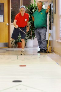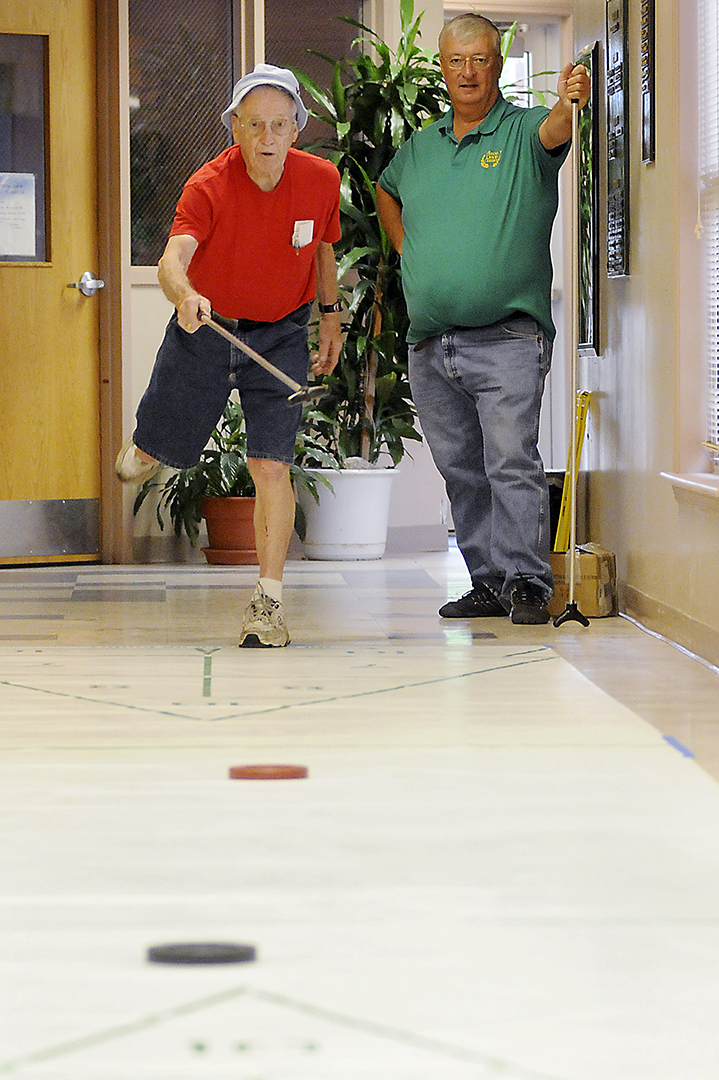 Howard Hall, 91, takes his turn while playing a team match of shuffleboard with Frank Miklavcic during the Kentucky Capitol Senior Games at the Franklin County Senior Activity Center. Hall won a gold medal in the event.
