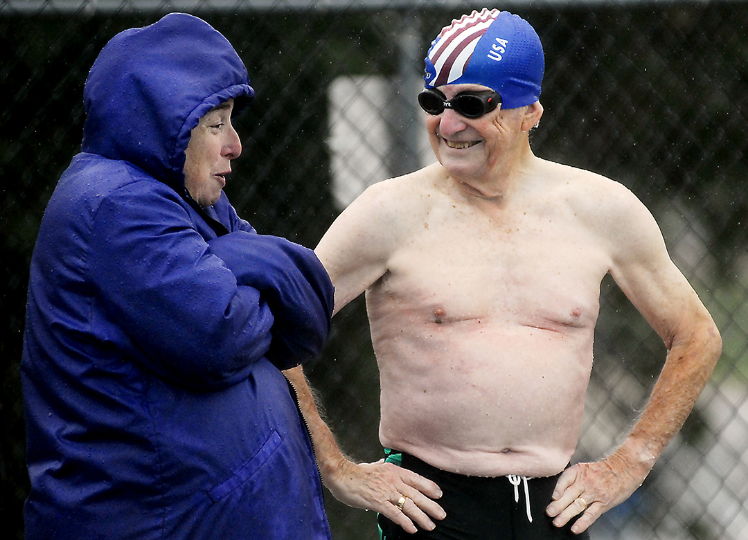 Vicki Catlin, 66, of Louisville, shivers in the cold rain while talking with Howard Hall, 91, as he waits for the start of his next swimming event during the Kentucky Capitol Senior Games swimming competition at Juniper Hill Pool.