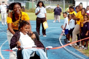 Natchez High School junior Toya Marsaw, 17, pushes athlete Veronica Nickelson across the finish line for a first place finish in the 25-meter wheelchair race during the Special Olympics in Natchez, Miss.
