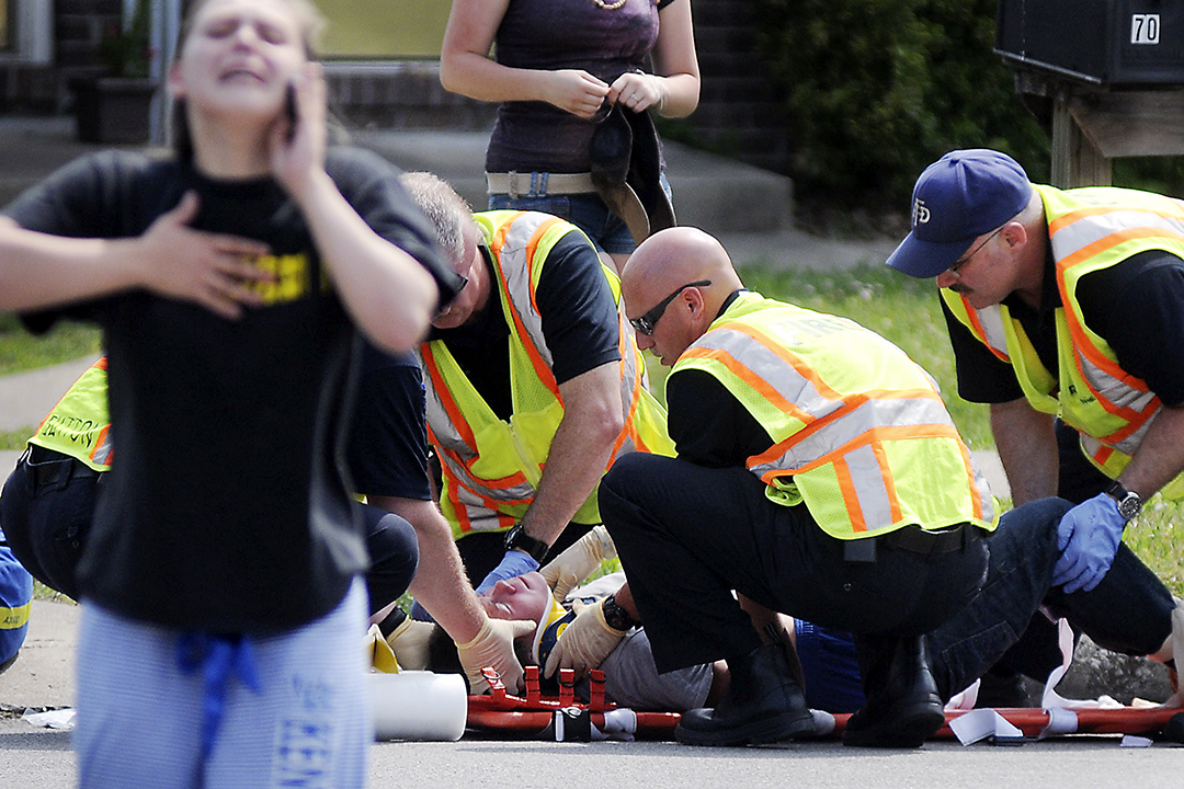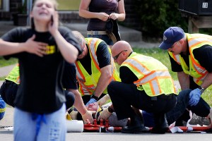 Rescuers load an 18-year-old woman onto a stretcher after she was hit while walking along Ridgeview Drive around 4 p.m. in Frankfort, Ky.