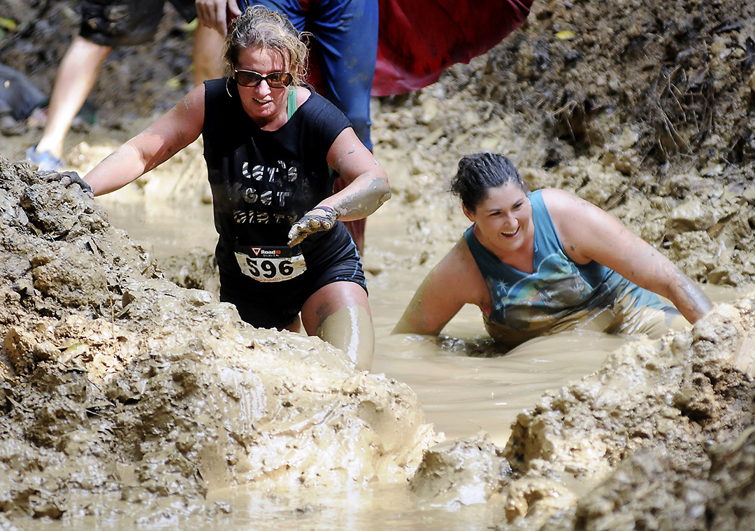 September 1, 2014September 1, 2014 / brownhannah14 Cindy Smith and Teresa Hester make their way through a mud trench during the Capitol City River Dash.