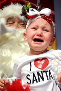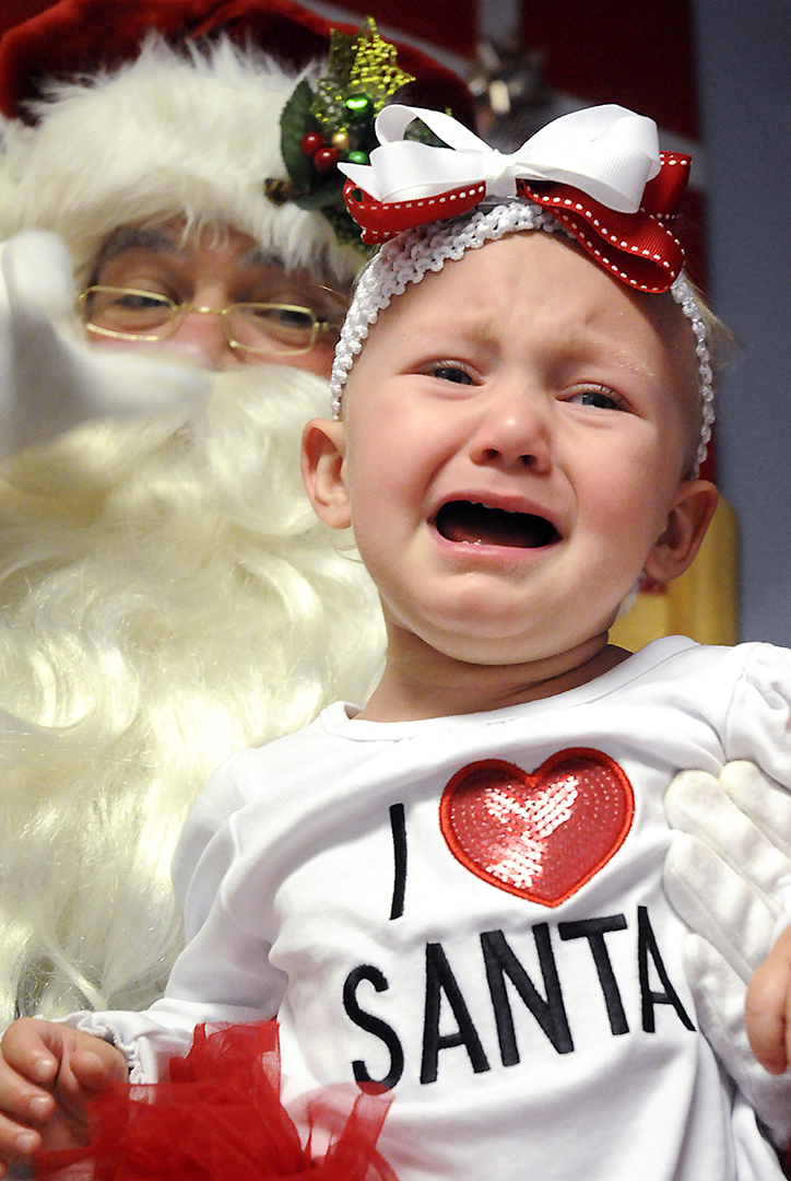 Wearing an “I Love Santa” shirt Kenlea Morris, 1, cries as Santa tries to get her to look at the camera for a picture during his visit to The Nest Preschool on East Main Street in Frankfort, Ky.