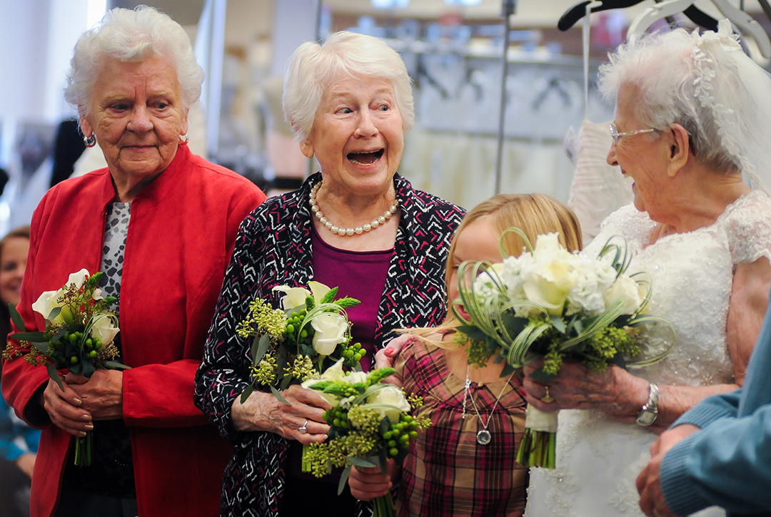 Bridesmaids Betty Flora and Jean Broome laugh with Ruth Sullivan as they stand to have their pictures taken at David’s Bridal in Lexington.